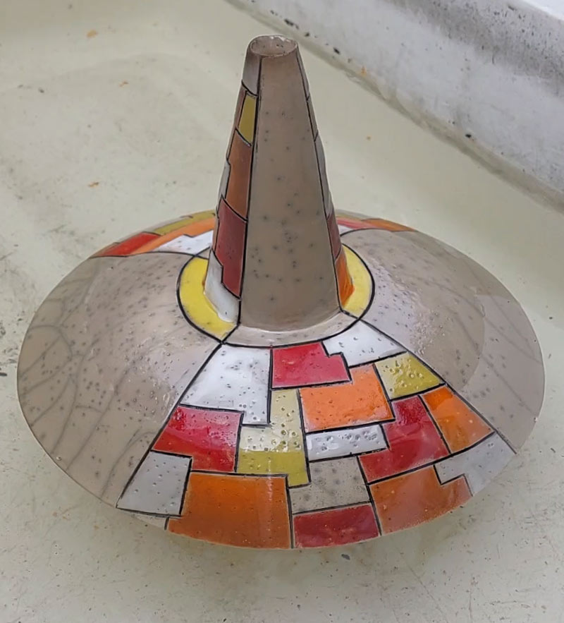 versieht die bei ca. 900 Grad geschrühten Scherben mit Raku-Glasuren. Nach 1 bis 2 Tagen Trocknung werden die Keramiken in den mit Gas befeuerten, ca. 1000 Grad heißen Raku-Ofen gestellt. Sind alle Glasuren glattgeschmolzen, werden die glühenden Gefäße oder Formen mit langen Zangen aus dem Ofen gehoben. Beim Abkühlen an der Luft reißt die Glasuroberfläche, man hört es knacken, die typischen Risse entstehen. Werderkeramik stellt die Gefäße und Formen in einen Topf mit organischen Stoffen wie Sägespäne oder frischer Nadelreisig, welches sich entzündet und Rauch bildet. Mit weiteren Sägespänen werden die Keramiken abgedeckt und der Topf geschlossen. Durch das Reduzieren, d.h. den Entzug von Sauerstoff, setzt sich der Rauch in die Risse und nicht glasierten Flächen ab und färbt sie schwarz. Die Kunstwerke werden vorsichtig ins Wasser getaucht und die glasierten Stellen mit einem Schwamm vom Rußfilm befreit. Das Ergebnis ist einzigartig und nicht vorhersehbar, da sich die Farben in Verbindung mit Luft und Wasser neu entwickeln. Das Faszinierende ist das Zusammenspiel der Naturelemente. Jede Sekunde an der Luft, des Abkühlens, des Oxidierens und Reduzierens, das Spiel mit den Flammen und Temperaturunterschieden sorgt für unverwechselbare Unikate.